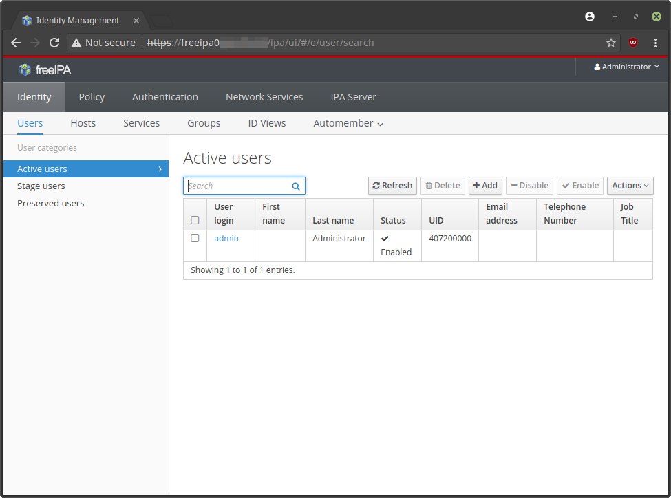 Rendez vous sur https://freeipa0.idm.demo.local et connectez vous avec l’administrateur freeipa définit plus tôt (admin)